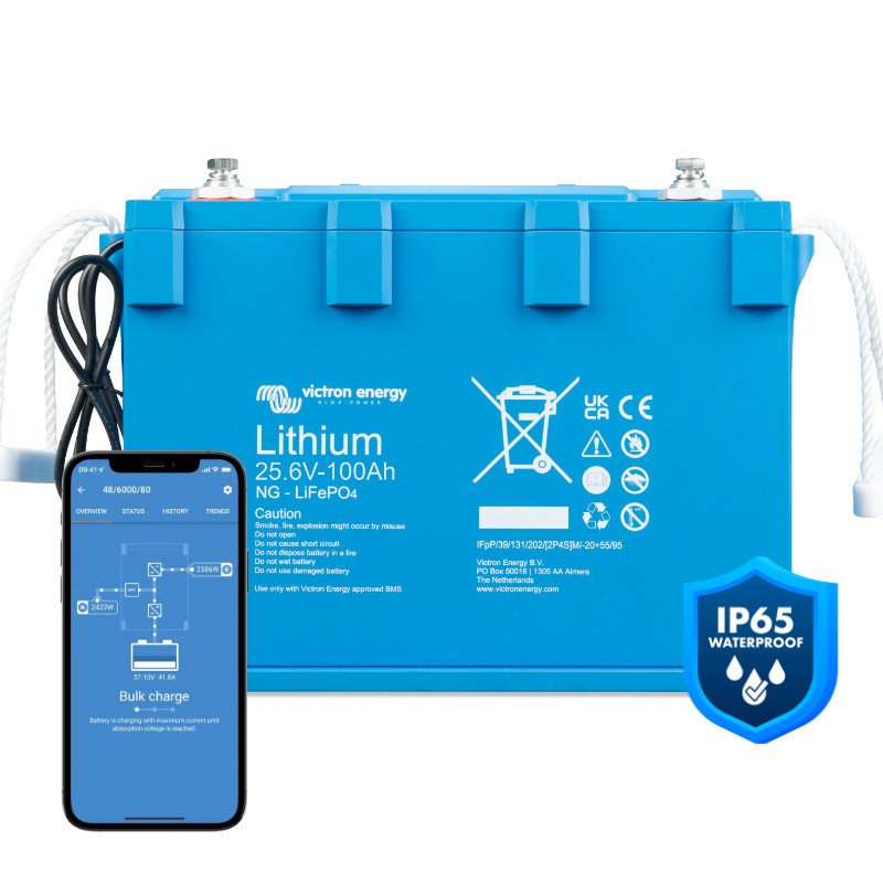 Victron Energy LiFePO4 Battery 25,6V/100Ah NG to nowoczesny akumulator litowo-żelazowo-fosforanowy, który oferuje niezawodne przechowywanie energii w kompaktowej, lekkiej konstrukcji. Wyposażony w inteligentny system zarządzania BMS oraz wbudowany moduł Bluetooth, pozwala na łatwe monitorowanie i kontrolę parametrów pracy za pomocą aplikacji mobilnych. Dzięki wysokiemu stopniowi ochrony IP65, jest odporny na kurz i wodę, co czyni go idealnym do wymagających warunków. Niski stopień samorozładowania i możliwość pracy w elastycznych konfiguracjach sprawiają, że doskonale sprawdza się zarówno w systemach mobilnych, jak i stacjonarnych.