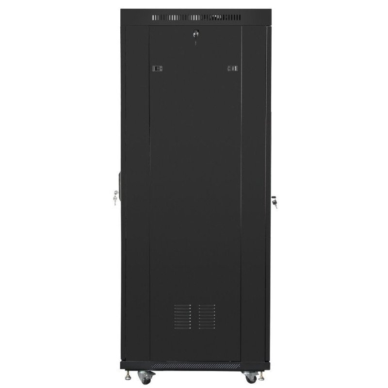 Szafa wyposażona w 4 regulowane szyny montażowe (przód i tył), numerowane odstępy 1U, górne i dolne przepusty kablowe z zaślepkami, kółka z hamulcem i nóżki poziomujące. Dostarczana w formie flat-pack – łatwa w transporcie i montażu.